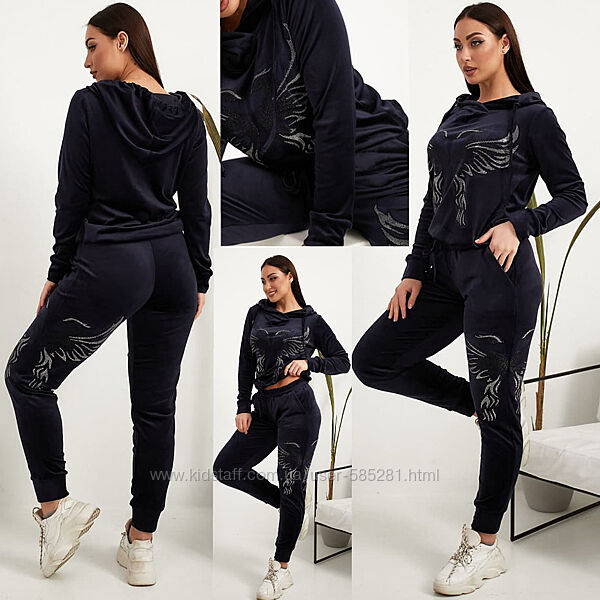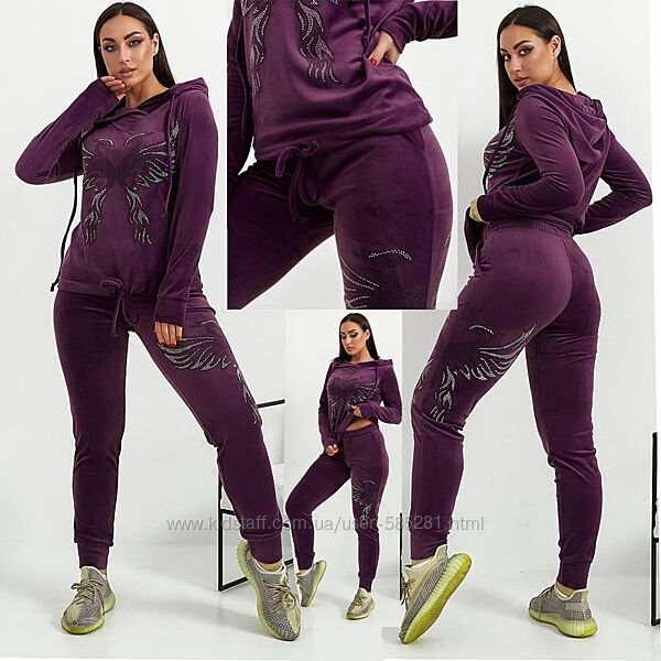 прогулочный спортивный велюровый костюм в стильном трендовом дизайне, качественное исполнение, ткань турецкий велюр, хорошо ложится по фигуре, смотрится костюм оригинально за аппликации из страз, на размеры 48-54-штаны с карманчиками, в поясе широкая резинка, внизу на манжетах,