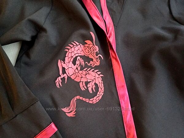 Пропоную карнавальний костюм Ніндзя - кімоно та штани, пояс нажаль втрачений. Вживаний 1 раз акуратно, стан загалом добрий, але через прання є темні плями на блискучому оздобленні, дивіться фото.Розмір вказано на 5-6 років, але трохи більшемірить. Довжина мантії від плеча до низу 54 см, ширина плечей 36 см, довжина рукава 45 см, ширина грудей під пахвами 45 см. Штани - довжина 75 см, ширина талії 25-38 см, тягнеться.