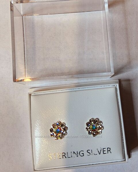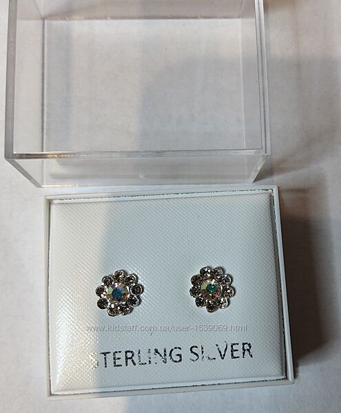 Стильні сережки пусети Sterling Silver із стерлінгованого срібла 925 проби в коробочці. Центральний камінь - хамелеон, інші 9 шт - білі камінці.Сережки мерехтять як діаманти. На сережках вибито пробу 925.