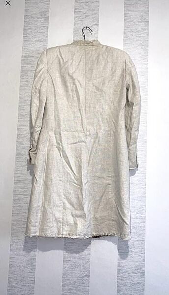 Плащ, тренд льняний, на підкладці,в ідеальному стані. Льон 100%. Плотний, з підплічниками . Застібка на металевих кнопках. Накладні кармани. Розмір 46.Пог 50см, пот 45см, поб 53см, довжина 98 см, рукав 60 см, плечі 41см.