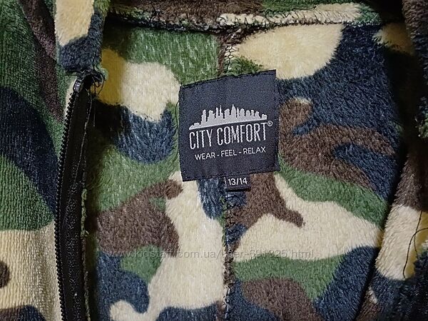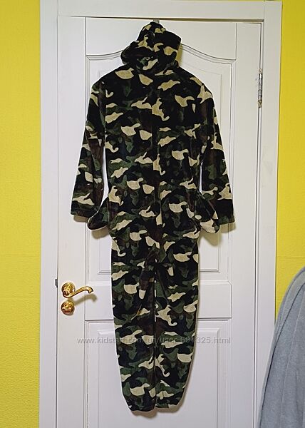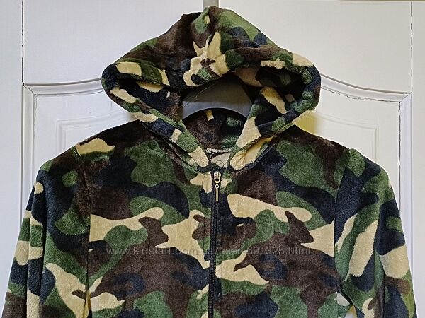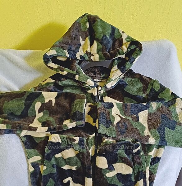 Пропоную теплу махрову піжаму-сліп камуфляжного забарвлення. Ворс - велсофт двобічний. Є кармани. Вживана акуратно, стан відмінний, дивіться фото.Розмір вказано на 13-14 років, довжина від плеча до промежини 76 см, до низу 134 см, ширина плечей 40 см, довжина рукава 57 см, ширина грудей під пахвами 48 см.