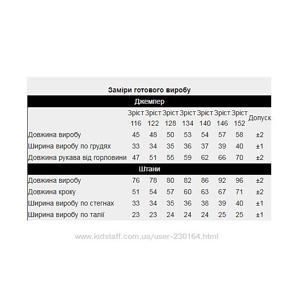 | Рост | 104 см, 110 см, 116 см, 122 см, 128 см, 134 см, 140 см, 146 см, 152 см |