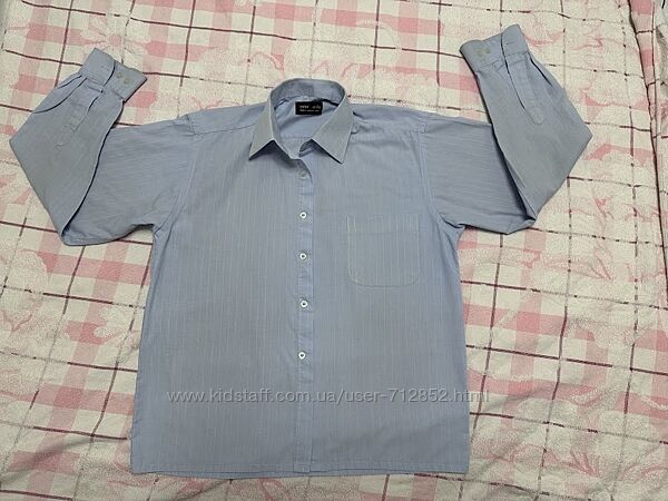 2) голубая рубашка в полоску с длинным рукавом. Б/у в хорошем состоянии, без дефектов, все пуговицы на месте. Размер на 9-11 лет. Подойдет на рост 140-146.