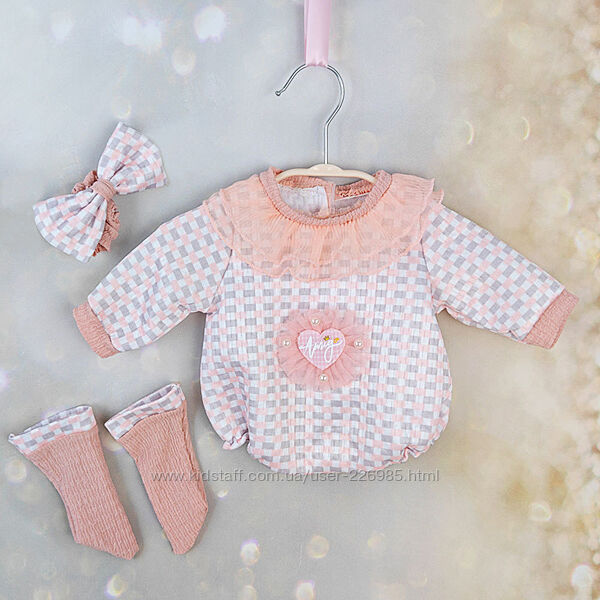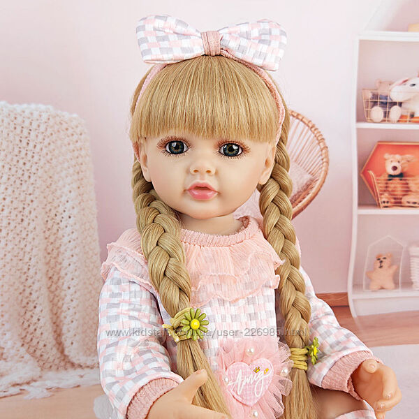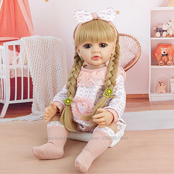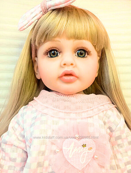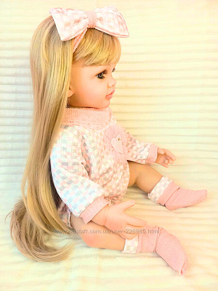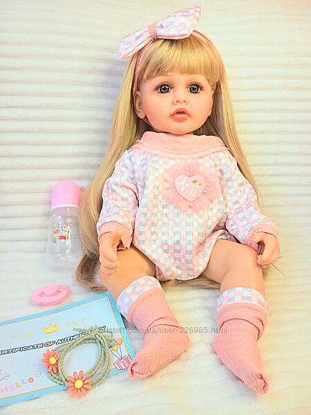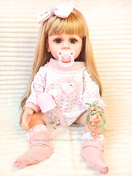 Лялька розмальована вручну акриловими фарбами.Тіло вініл-силіконове, її можна купати.Руки, ноги, тулуб і голова з якісного м´якого силікону.Ручки і ніжки рухливі, лялька може сидіти і лежати.Очі виготовлені з акрилу (не закриваються). На повіках пухнасті вії.Довге пишне волосся ідентичні натуральному, можна розчісувати. Головку можна повертати у різні боки.Лялечка одягнена в нарядний комбінезон, гольфи , на голові пов´язка - бант.Соска на магніті, пляшка, підгузок.Свідоцтво про народження пусте (можна вписати будь-яке ім´я).Характеристики: