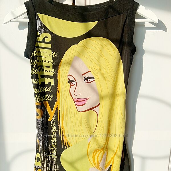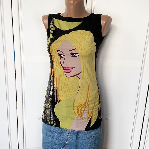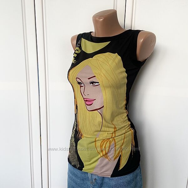 Футболка-майка с принтом блондинки,р.М Отличное состояние,стрейчевая, дефектов нет. Длина 62, ПОГ 37-43, ПОТ 35,5-43, шир. по низу 40,5-49, по плечам сзади 31 см