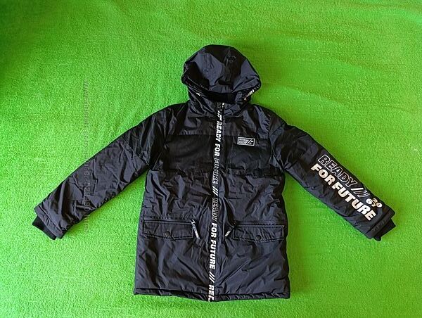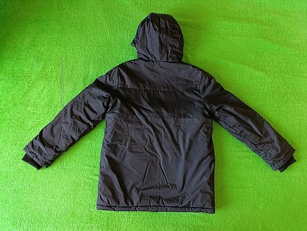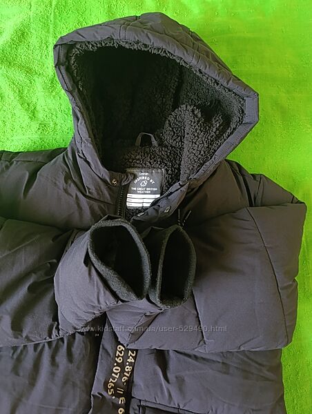 - удлиненная черная зимняя куртка/парка со светоотражающими надписями Джордж, указан размер 146-152, 11-12 лет. Внутри плотный слой утеплителя с меховой подкладкой, верхняя ткань непромокает, ветронепродуваемая, застёгивается на молнию, закрытую планкой, рукава имеют эластичные манжеты. В идеальном состоянии.