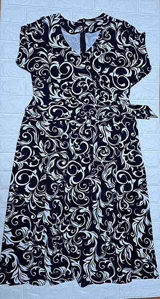У чудовому стані. Є поясок. Тканина тягнеться. Гарно сидіти на фігурі. Можна одягнути білизну з утяжкою, видно не буде. Заміри: длина 114 см., талія 42 см., плечі 36см., рукав від плеча 57 см., ширина подолу по низу 114 см. Була дуже задоволена цим платтям, але нажаль вже маленьке. Відповідаю на всі запитання.
