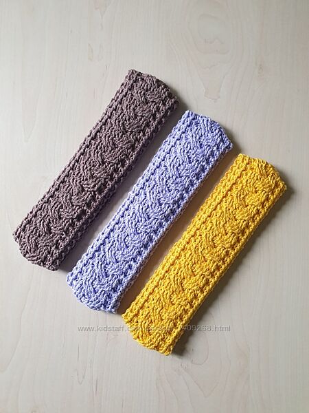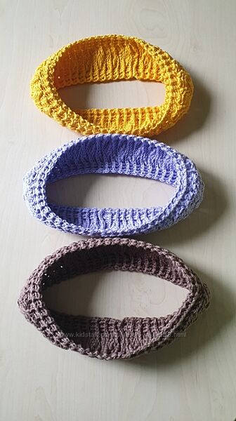Пов´язка на голову зв´язана гачком з якісної турецької пряжі Yarnart Baby Cotton(бебі коттон). Ручна робота. Baby cotton - напівбавовняна (50% бавовна, 50% акрил), гіпоалергенна, дитяча пряжа, дуже м´яка, приємна на дотик. Речі з цієї пряжі добре пропускають повітря, вбирають вологу, відмінно тримають форму та переносять багаторазове прання. Розмір: ширина - 6 см, довжина залежить від обхвату голови. У наявності є пов´язки 3 кольорів: кава з молоком та темно жовтий, довжина 57 см. Приймаю замовлення на пов´язки різних кольорів (яскрава колірна гама дозволить обрати колір на будь-який смак) та довжини.Другие объявления продавца