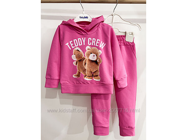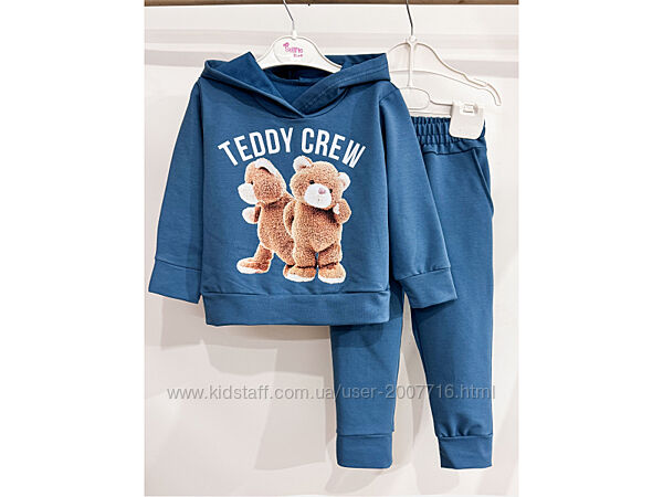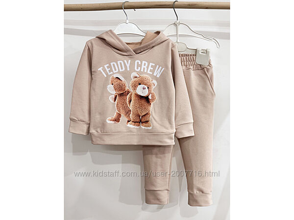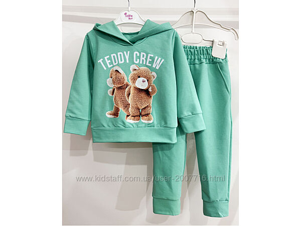 Костюм для хлопчика та дівчинки (джемпер з довгим рукавом, низ та рукав під манжет з основного полотна, є капюшон, декор трансфер + штани під манжет на широкій резинці), якість полотна дуже класна, не кошлатиться підійде для дітей від року до 6-7 років.Пошитий з хб тканини 2-х нитки, вона відрізняється особливою міцністю і еластичністю.