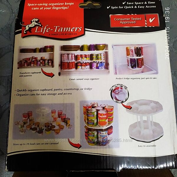 Органайзер підставка тримач для банок та консервів CAN Tamer, новий.Завдяки Can Tamer можна однаково і зручно розташовувати в одній позиції банки, які більше не займуть занадто багато місця! Дворівнева підставка дозволяє вміщати 13 різних банок з напоїв або 39 консервних банок, а поділ між секціями, допоможе міцно зафіксувати їх. Конструкція підставки обертається на 360 градусів, забезпечуючи ще більше зручність у використанні!
