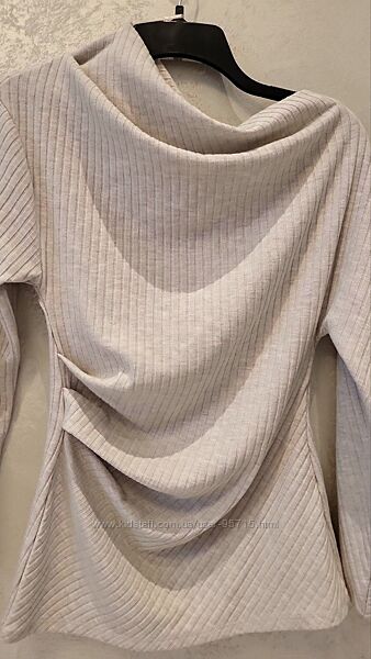 Топ з асиметричним вирізом і довгими рукавами. Відкрите плече і драпірування збоку.