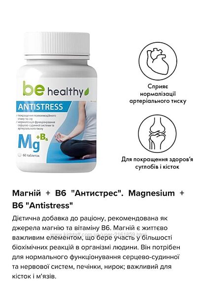 60 капс.Дієтична добавка до раціону, рекомендована як джерела магнію та вітаміну В6. Магній є життєво важливим елементом, що бере участь у більшості біохімічних реакцій в організмі людини. Він потрібен для нормального функціонування серцево-судинної та нервової систем, печінки, нирок; важливий для кісток і м´язів. Магній допомагає регулювати та обмін інших необхідних речовин в організмі, таких як кальцій, калій, цинк і вітамін D.