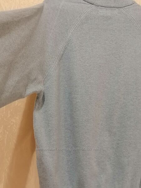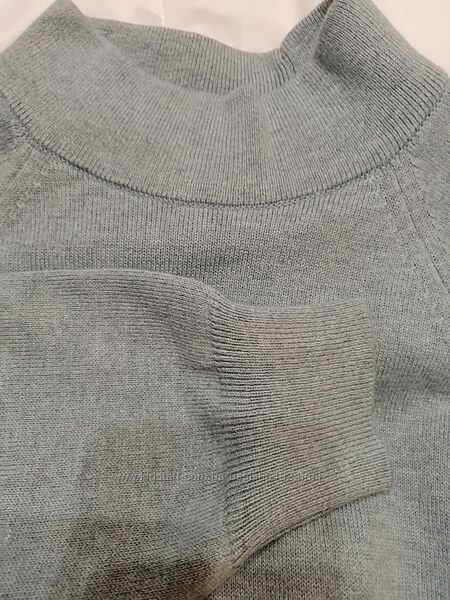 Колір фото зовсім не передає, він світлий молочно блакитний, може трішки блакитно попелястий, не яскравий. Низька пройма реглану. Облямовка гумкою щільна, добре закриває шию.