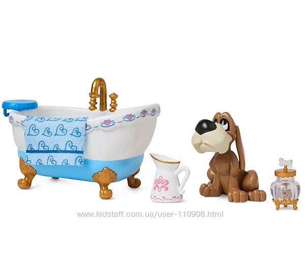 Аксессуары включают полотенце, резиновая уточка, банка, кувшин и мыло.