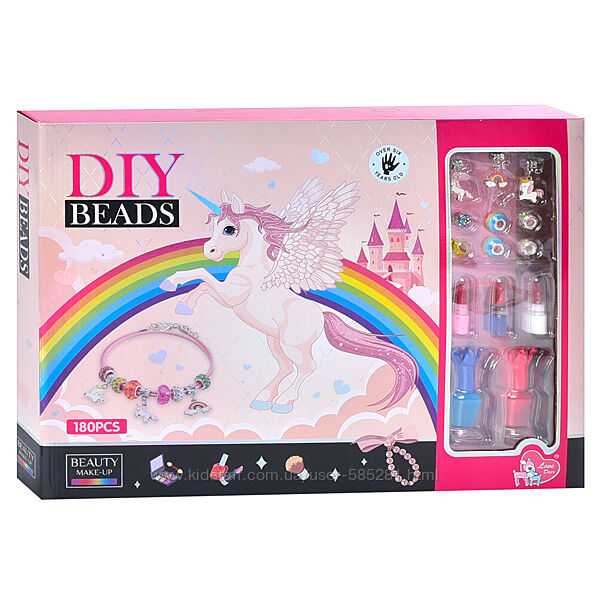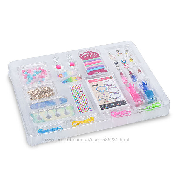 багатофункціональний набір для Вашої юної леді, приладдя для плетіння браслетів, дитяча косметика та аксесуари, в набір входять: намистини різних кольорів та фактур, нитки різних кольорів, різні підвіски, шпильки для волосся та гумки, сережки, лаки, помади, пилочка для нігтів, роздільник для пальців, розмір коробки 35,5-25-4 см