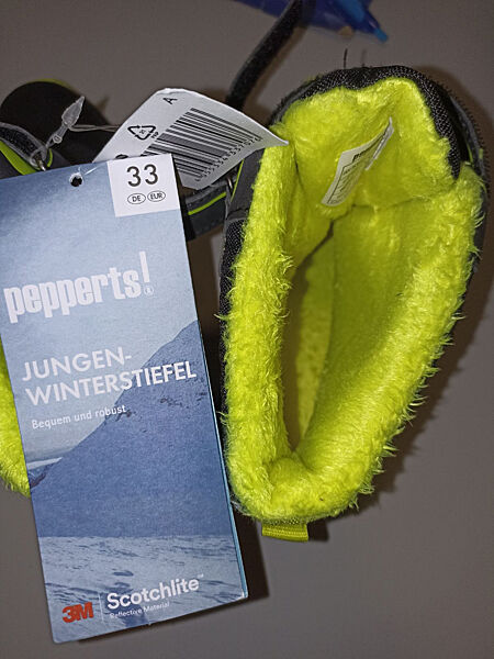Чоботи-черевики (сноубутси) Німецької фірми Pepperts, легкі, теплі з фольгованою устілкою для кращого збереження тепла. Ідеальні на сльоту та мокрий сніг. Відмінна якість. Верх - комбіновані матеріали водо, вітронепроникні, всередині м´який утеплювач, додатковий внутрішній шар термо-фліс. Підошва профільна, не ковзає. Є світловідбиваючі елементи. Сезон холодна осінь-весна (єврозима). Дуже практична модельЗаміри: Устілка: 20,5 см