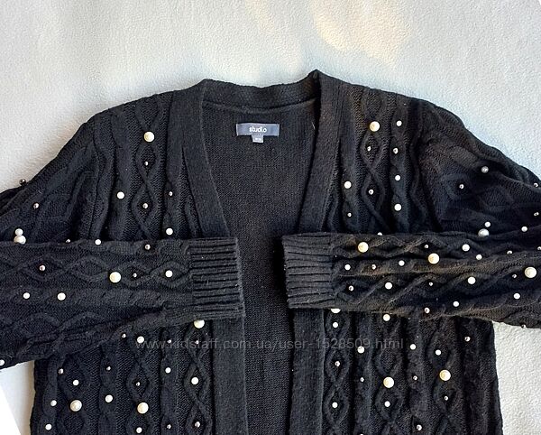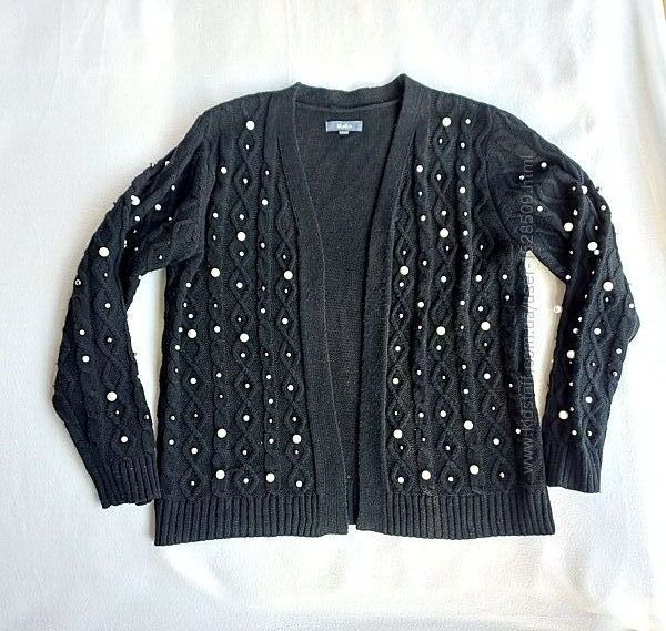 Чорний в´язаний кардиган з перлинами. 100% акріл. Застібки немає. Вживаний акуратно, стан дуже добрий, дефектів немає, дивіться фото.Розмір вказаний 12/14. Довжина 68 см, довжина рукава від шиї 77 см, ширина спини під пахвами 58 см, тягнеться добре.