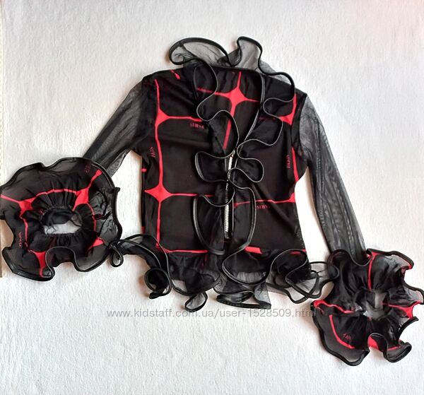 Чорна блузка з воланами. Матеріал сітка стрейч, застібка блискавка. Вживана 1 раз акуратно, стан відмінний, дефектів немає, дивіться фото.Розмір приблизно S, добре тягнеться. Довжина 42 см, ширина плечей 35-45 см, довжина рукава 60 см, ширина грудей під пахвами 44 см, тягнеться до 60 см.