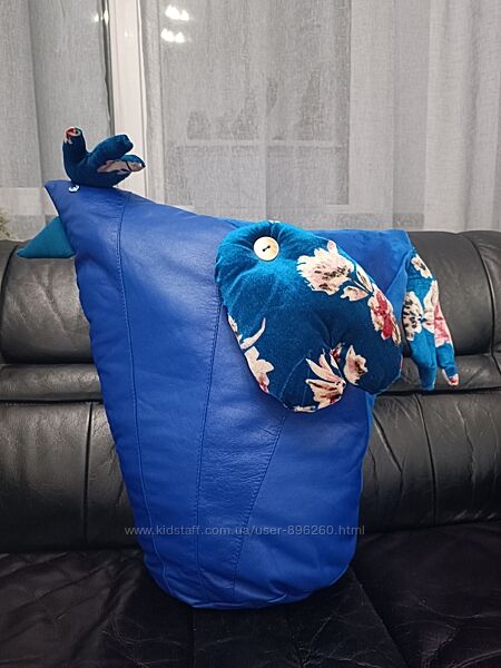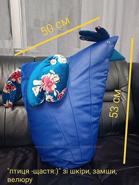Декоративна подушка птиця -щастя ручної роботи, виконана зі шкіри, замшу і велюру. Розміри на фото. Цікавий, оригінальний подарунок для близьких людей.Робіть свій вибір свідомо, повернення не передбачено.