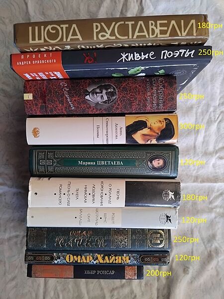 А. Ахматова Стихотворения. Поэмы(БВЛ) 300грн Живые поэты (БГ, Арбенина и др.) 250грн М. Цветаева Стихотворения, поэмы120грн О. Хайям Рубаи. Хафиз Газели 250грн О. Хайям Чаша мудрости 120грн П. Ронсар О вечном 200грн Песнь о Роланде. КоронованиеЛюдовика. Песнь о Сиде 180грн Р. Бернс Стихотворения, поэмы,Шотландские баллады 120грн С. Есенин Собрание сочинений 250грн Ш. Руставели Витязь в тигровойшкуре (иллюстрированное издание) 180грн