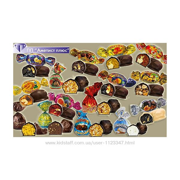 Цукерки Аметист плюс (Дубно) в асортименті.Фрукти в шоколаді: чорнослив, курага, фінік, диня, персик, інжир.