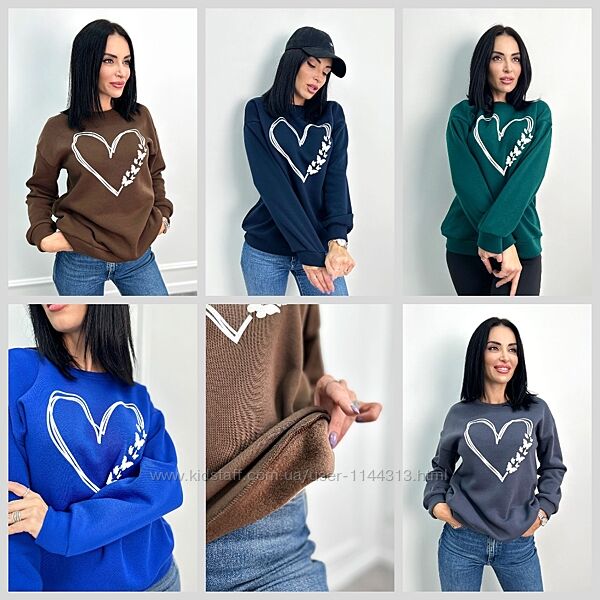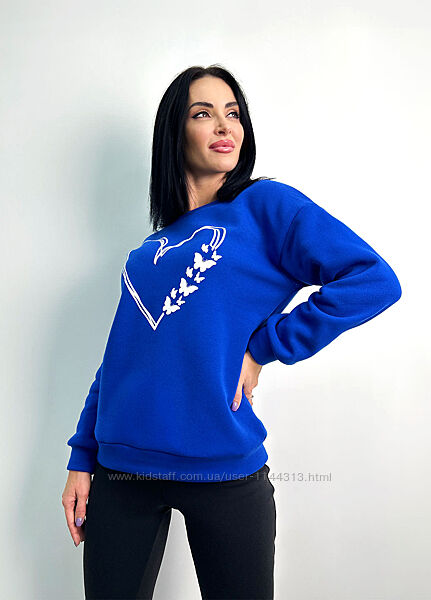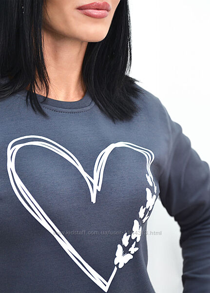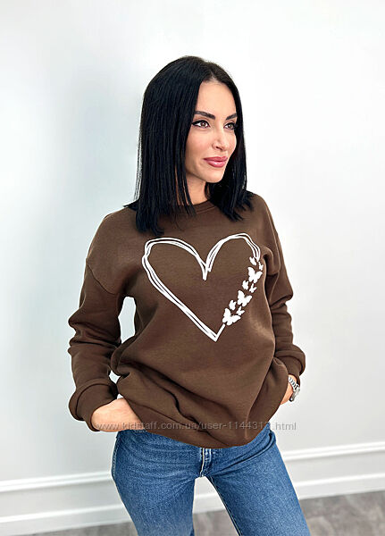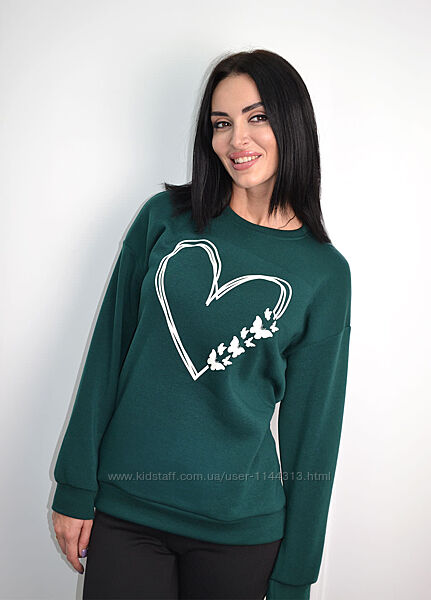 Класичний світшот зі спущеною лінією плеча і округлою горловиною. Має вільний прямий крій, довгі рукави та широкі манжети на рукавах та внизу виробу. Великий принт у вигляді серця та метеликів виконаний у техніці накатки.Колір: темно-зелений, електрик, темно-синій, графіт, шоколадний
