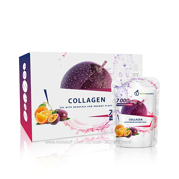 ESSENS Collagen - це біологічно активна добавка із серії NUTRIESSENS у вигляді апетитного фруктового гелю з вмістом соку апельсина, зі смаком маракуї. Унікальна кількість гідролізованого свинячого та нативного рослинного колагену в поєднанні з екстрактом ацероли (вітамін С) і L-триптофаном забезпечують його максимальне засвоєння організмом. Продукт не містить цукру, глютену та лактози.Колаген - це білок, який є основним будівельним матеріалом сполучної тканини в організмі. Колаген ESSENS Collagen виготовлений зі свинячого колагену типу I і III та рослинного нативного колагену типу II.