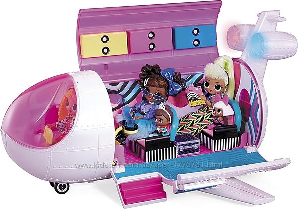 Зустрічайте оновлений літак для лялечок L.O.L. Surprise! На Вас чекають 4 ігрові зони та безліч аксесуарів. Багатофункціональний літак-трансформер стане відмінним подарунком!Літак поєднує в собі 4 ігрові зони - літак, автомобіль, студія звукозапису, пульт звукорежисера.Більш ніж 50 сюрпризів при розпакуванні.4 місця на борту літака підходять також для ляльок серії «О.M.G».Продумані всі деталі - сидіння регулюються та переставляються, двері літака відчиняються, відсіки висуваються, ящики та комірки функціональні.У наборі безліч аксесуарів для комфортного польоту Ваших ляльок: валізи, стіл для їжі, чашки, навушники, пов´язки на очі та багато іншого.Турбіни літака світяться.До набору входить: