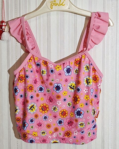 Рожевий роздільний купальник від Lupilu з смайліками Emoji у розмірі 122-128.Топ прикрашен воланами.