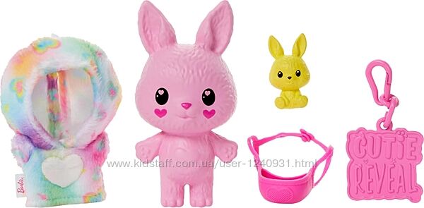 З 5 сюрпризами в одному наборі домашні улюбленці Barbie Cutie Reveal подарують усілякі розваги: зайчик, зебра, пінгвін чи далматин. Які ви відкриєте?Кожен чарівний вихованець у цій барвистій серії, натхненній мріями, одягнений у плюшевий костюм із унікальним райдужним принтом і великим серцем посередині.