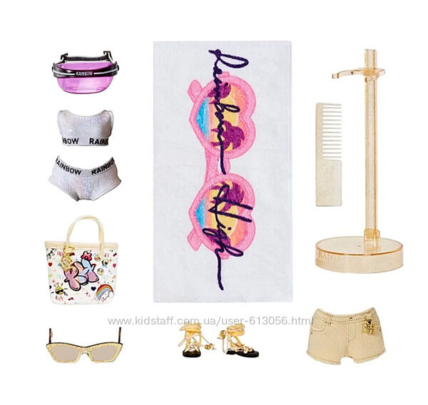 У набір входять: лялька,комплект одягу, пляжне взуття, пляжні аксесуари,підставка.