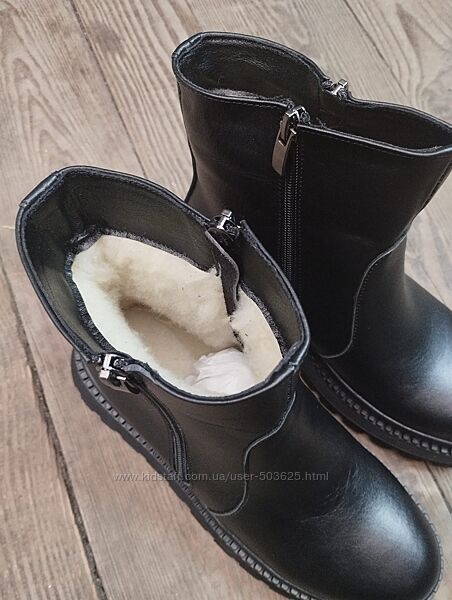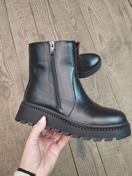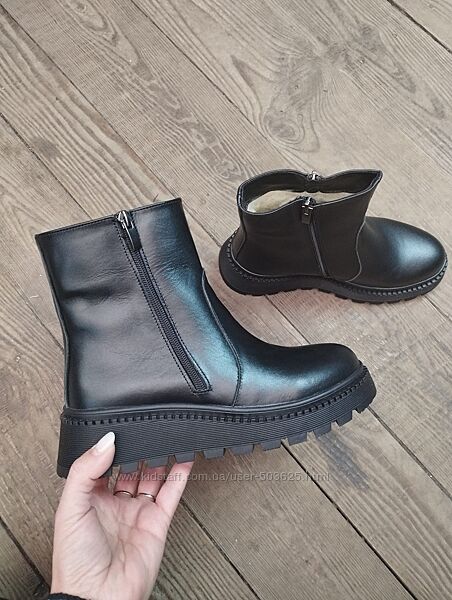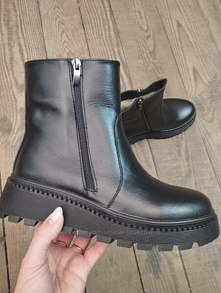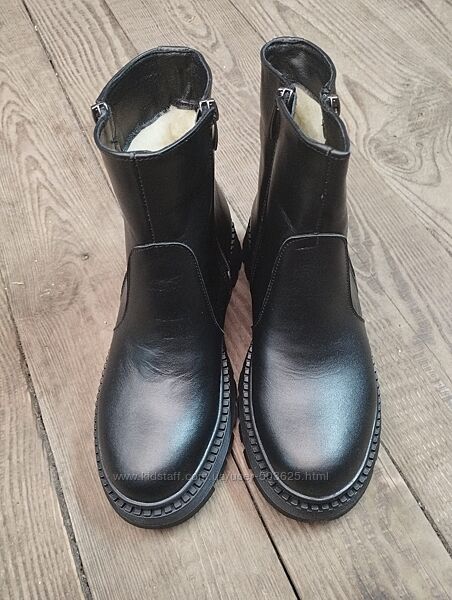 Стильні черевики з натуральної шкіри. Збоку є функціонуючий замок для зручності, другий замочок - для краси (не функіональний).Взуття гарно пошите, гарно виглядає на нозі. Підошва морозостійка і якісна.