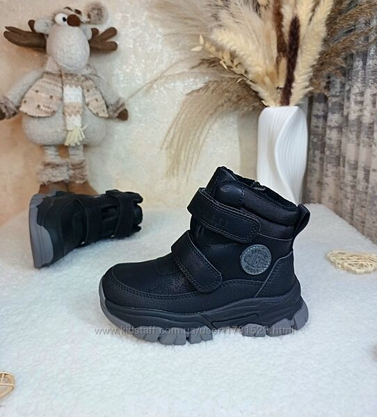 Зимові черевики з нової колекції від Clibee для хлопчиківВерх якісна еко-шкіра, дуже легенькі. Всередині густа овчина 60% натуральна. Захисний прорезинений носок і п´ятка. Фіксація 2 липучками, збоку на замочку. Підошва антиковзна. Температурний режим до - 30°