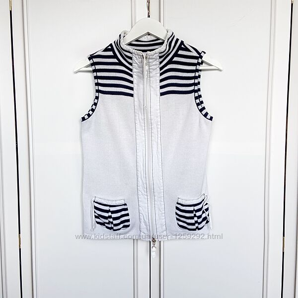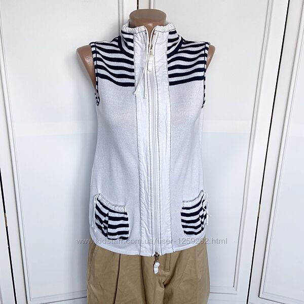 Жилетка в морском стиле Bonita,р-р S,пойдет и на М 50 % хлопок 50 %акрил Отличное состояние,дефектов нет. Длина 61 см ПОГ 44-50 тянется,ПОТ 40,5-45 Плечи сзади 34 см. Личных встреч нет! Цена окончательная!Торга нет. Доставка Укрпочтой,Новой почтой. Оплата на карту Приватбанка.