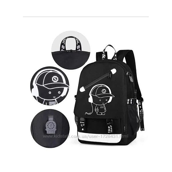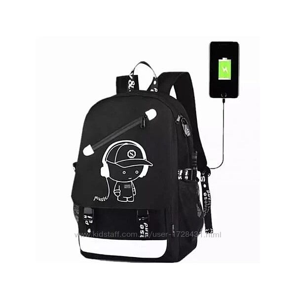 Водонепроницаемый рюкзак мusic с USB светящийся в темноте, цвет черный.Удобный и стильный рюкзак порадует вас своим качеством и функциональностью.