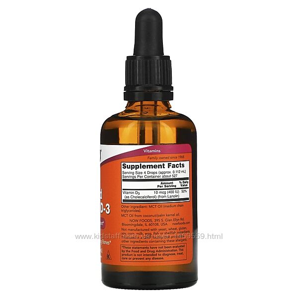 NOW Foods рідкий вітамін D3 10 мкг 400 МО 59 мл 2 рідк. унціїПідтримка опорно-рухового апарату400 МО в 4 крапляхДопомагає зберігати міцність кістокВітаміниВиготовлено на підприємстві, що має реєстрацію GMPКожна крапля містить 100 МО вітаміну D, 4 краплі містять 400 МО, 20 крапель забезпечують 2000 МО.