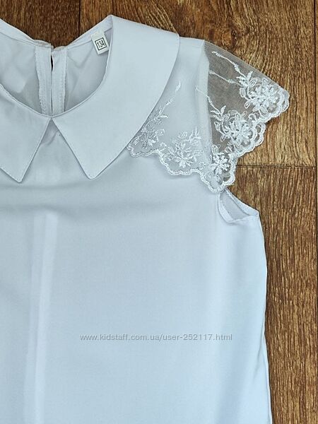 Блузка в идеальном состоянии, надета была 1 раз, на рост 134 см, сзади на шее застегивается на пуговицу. Замеры - длина от плеча 45-47 см (по спинке длиннее), ширина под ручками 35,5 см плечи 26 см.