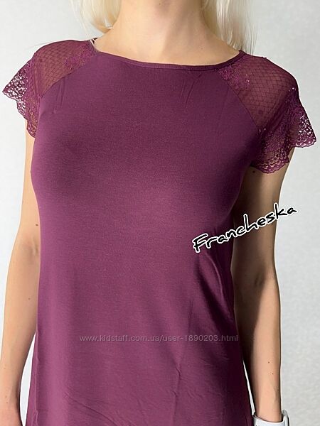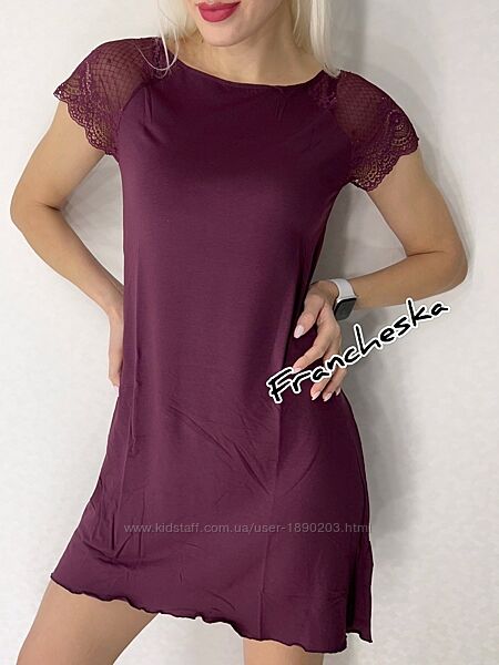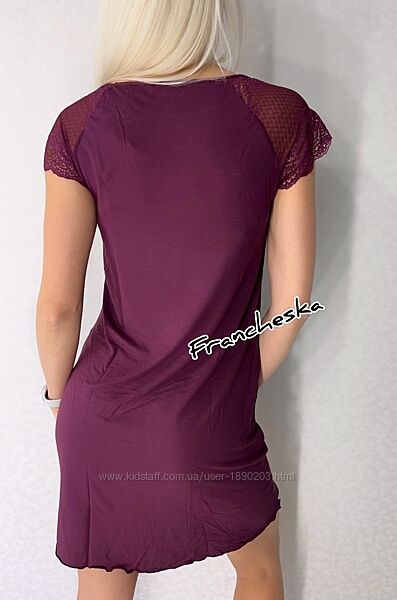 Нічна сорочка однотонна з коротким мереживним рукавом "CABERNET" (LDM 108/00/02) від українського виробника ТМ Ellen можна придбати за доступною ціною у нашому інтернет магазині Francheska.Жіноча нічна сорочка виконана з м´якого модалу бордового кольору, вільного силуету, з короткими рукавами та круглим вирізом горловини. Довжина моделі вище коліни, рукави виконані з мережива.