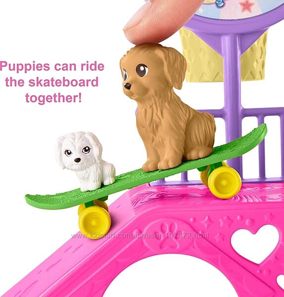 Відкрийте для себе світ веселощів і пригод разом з лялькою Челсі та її щенятами на ігровому майданчику зі скейтпарком від Barbie!Цей чудовий ігровий набір включає все необхідне для активного відпочинку: рампу для скейтбордингу, зону для пікніка, баскетбольне кільце та понад 15 аксесуарів. Скейтпарк пропонує безліч можливостей для рольових ігор та творчого самовираження!