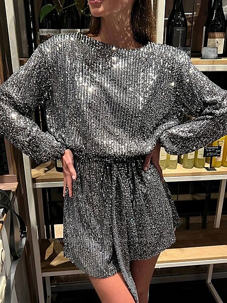 Вечірня сукня міні з паєтками з довгим рукавом з поясом блискуча