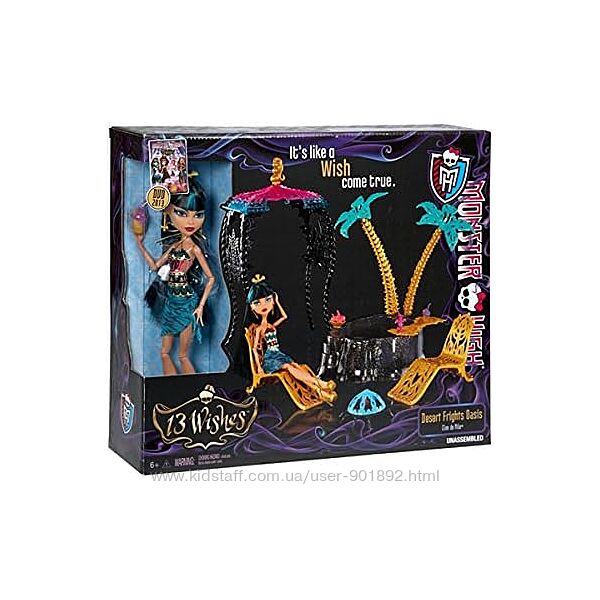 Монстер Хай Оазис пустелі та Клео Де Ніл 13 Бажань (Monster High Oasis Cleo De Nile 13 Wishes)Оазис у пустелі – єдине місце, де Клео де Ніл (Cleo de Nile) може сховатися від хаосу, який панує у школі. Вона готова скинути бинти та поніжитися у променях теплого сонця. Тут можна проводити вільний час, відпочиваючи під навісом, купаючись або ввечері гріючись біля багаття. Пальми з шезлонгом доповнюють краєвид. Дуже стильний, яскравий набір із тематичними аксесуарами. Клео в цьому наборі має надзвичайну красу.