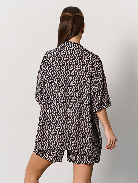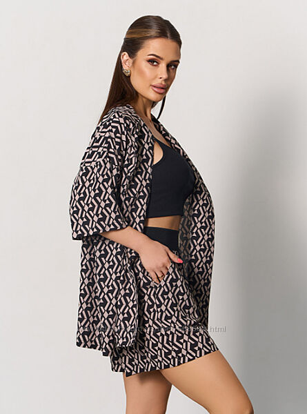 Повсякденний костюм вільного фасону з бавовняного штапелю з нашивкою на широкій поясній гумці шорт. Сорочка на ґудзиках з комірцем і рукавами до ліктів. Шорти з високою посадкою оснащено кишенями та декоративними ґудзиками.Розмірний ряд: S, M, L, XL