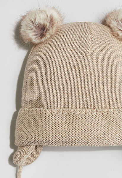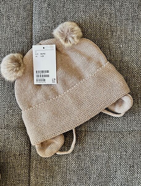 В´язана шапка з м´якої суміші бавовни від H&M коричньового кольору , з двома помпонами зі штучного хутра вгорі. Шапка має підігнуті поля, вушні краї та зав´язки під підборіддям. На підкладці з флісу.СКЛАД - 60% бавовна, 40% акрил.