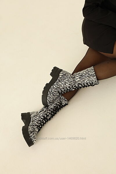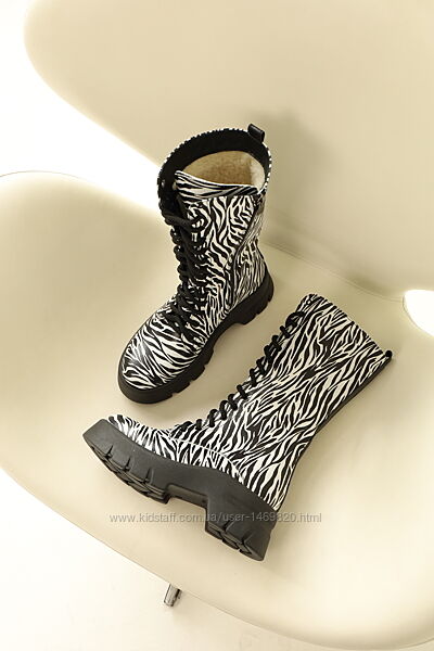 Ботинки зимние женские высокие черно-белые з принтом рисунком зебра кожаные на меху, на толстой подошве.