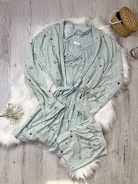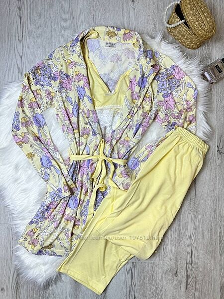 Пижама женская, домашний костюм Mihra. Комплект 3в1 халат топ штаны. Турция