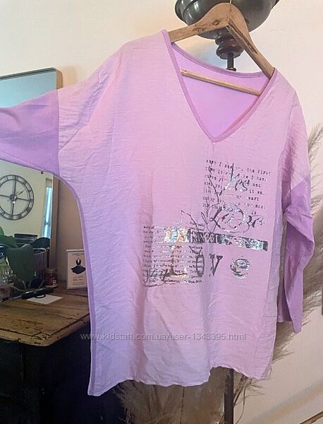 Італійській лонгслів вільного крою - 50% Віскоза та 50% БавовнаБузковий колір з прінтом під серебро