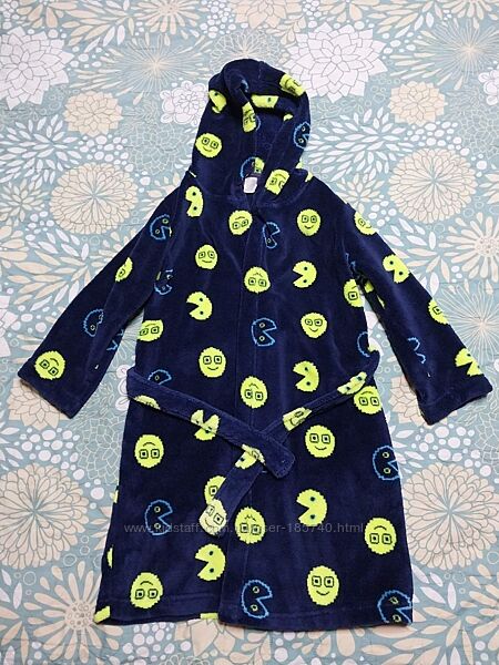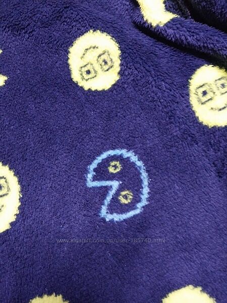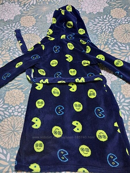 Без недоліків, стан дуже добрий, після однієї дитини, купувався новим. Пухнастий, приємний на дотик, легкий. Принт пекмен. Колір синій, салатові пекмени. Є капюшон та пояс. Зріст 110-116 ,може бути на довше. Можна носити в басейн, або вдома.Довжина від плеча 76 см, рукав 41 см.