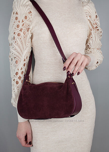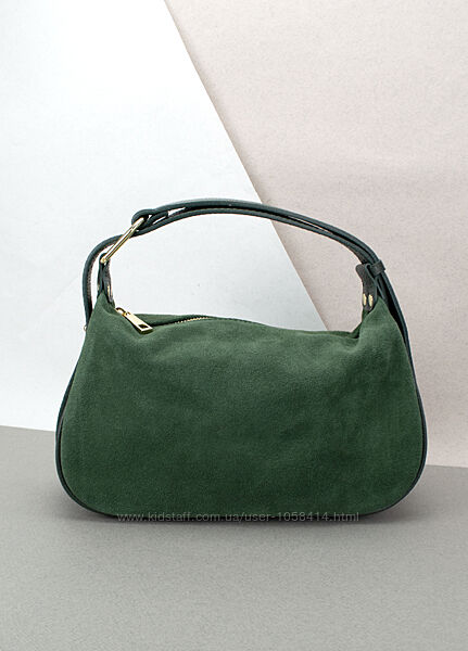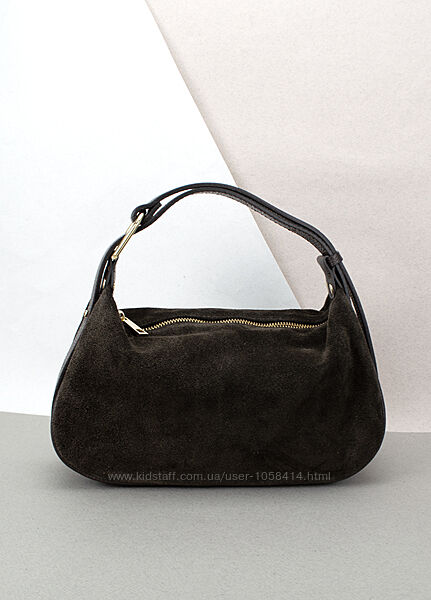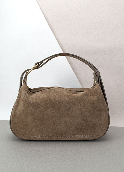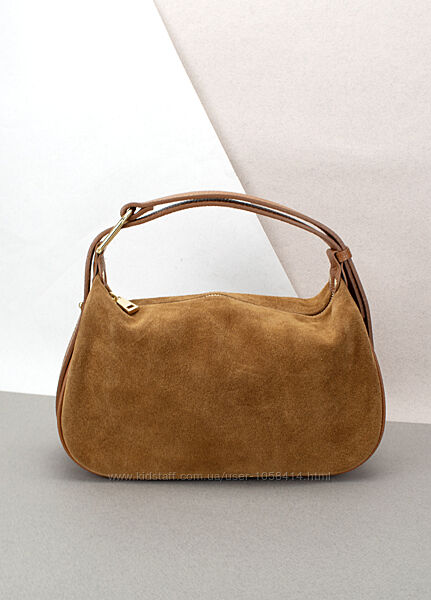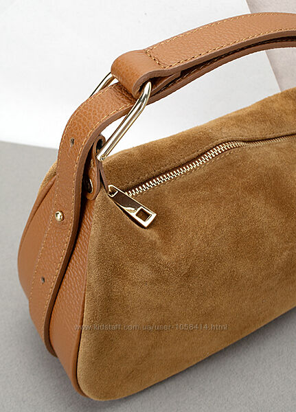Ця жіноча сумка вирізняється поєднанням натуральної замші та шкіри флотар. Аксесуар застібається на золоту блискавку, металеві кільця та кріплення золотистого відтінку доповнюють загальний дизайн, підкреслюючи його витонченість. Ручка виконана з натуральної шкіри, міцна та приємна на дотик, що гарантує комфорт навіть при тривалому носінні. Родзинкою даної моделі є можливість регулювання довжини ручки , що робить її універсальною для носіння як у руці, так і на плечі.Сумка має одне відділення, яке включає приховану кишеню на блискавці, яка ідеально підійде для зберігання дрібниць, таких як ключі або гроші, додаючи додаткову функціональність і зручність.