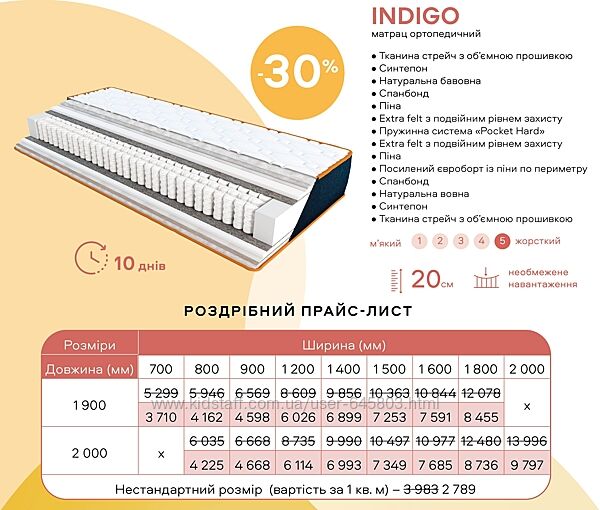 Стоимость размерного ряда матраса Indigo с учётом скидки 30% :