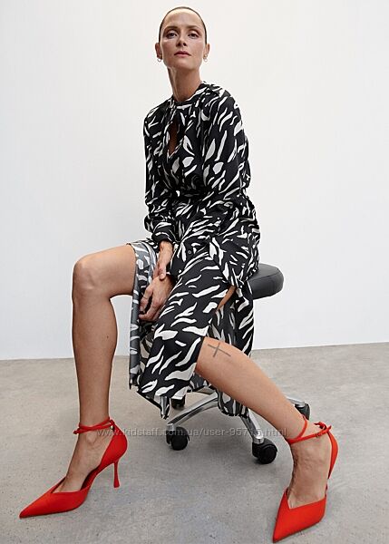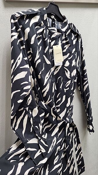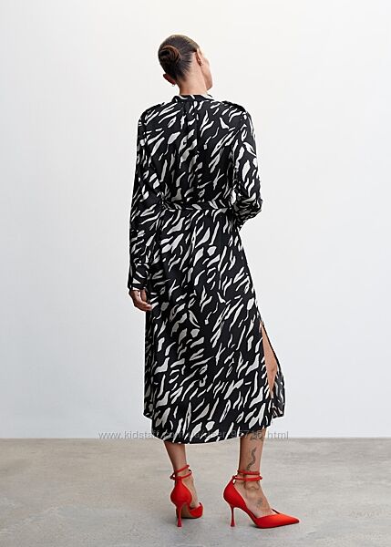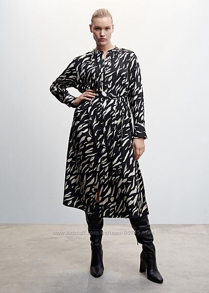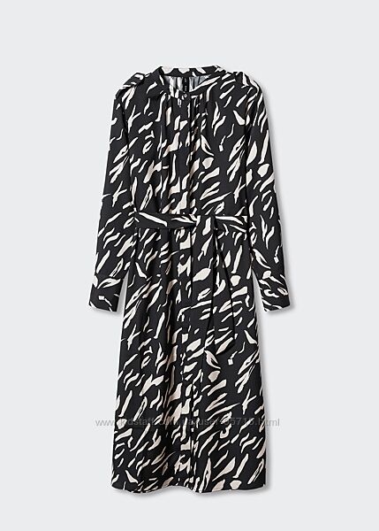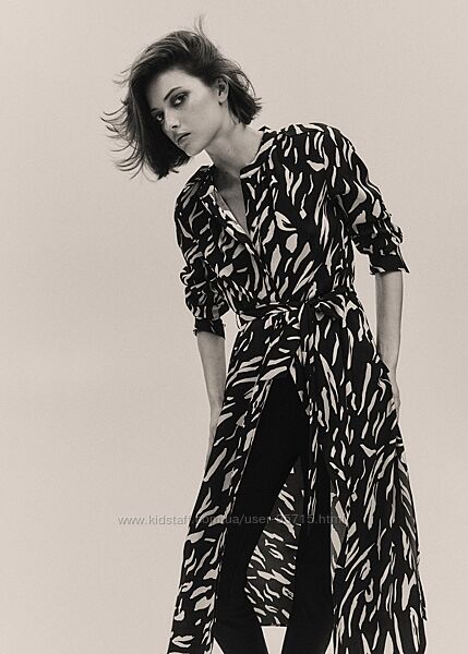 Струменева тканина. Абстрактний принт. Міді дизайн. Фасон "дзвін". Ремінь в тон сукні. Довгі рукави з гудзиками на манжетах. Спереду потайна застібка на гудзики. На талії регульовані зав´язки. Унизу розрізи. Колекція для вечірок та урочистостей.